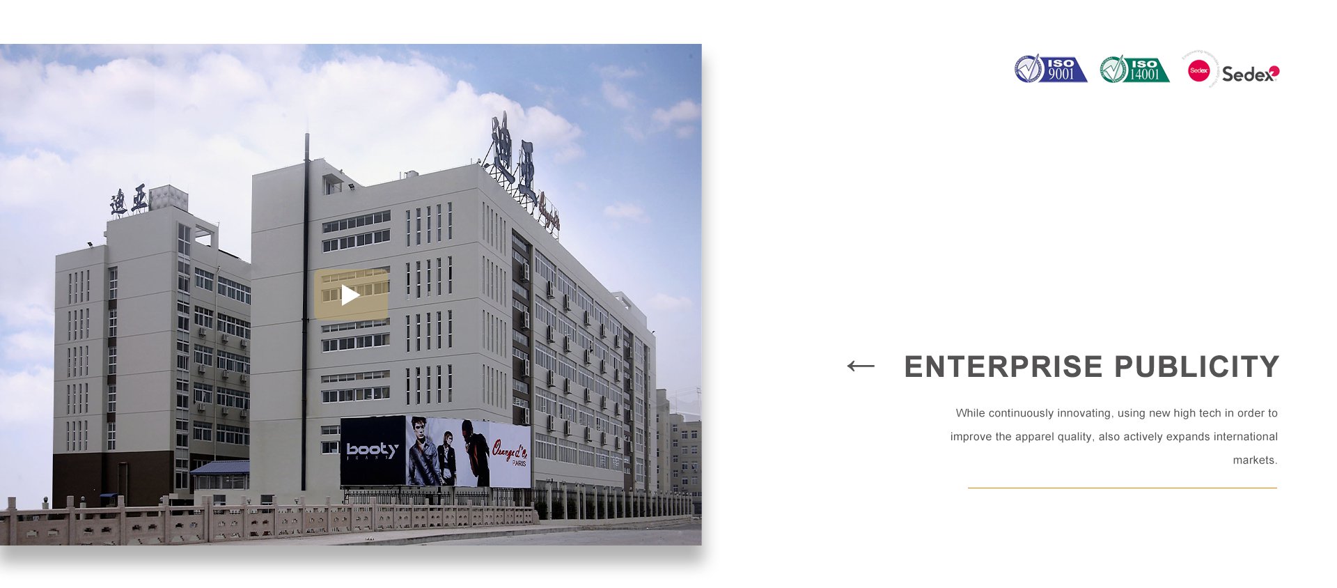 浙江迪亞服飾有限公司于1998年在世界時尚品牌之都——法國巴黎二區(qū)應運而生。同年,在浙江省甌海經(jīng)濟開發(fā)區(qū)東方南路28號設(shè)立服裝制造工廠。公司集服裝設(shè)計、生產(chǎn)、營銷、品牌于一體,在不斷創(chuàng)新、采用高新技術(shù)提高服飾質(zhì)量的同時,積極拓展國際市場,海外營銷部長期與LV集團旗下的MAJE、SOEUR、BALIBARIS等國際著名品牌保持非常緊密的合作關(guān)系。